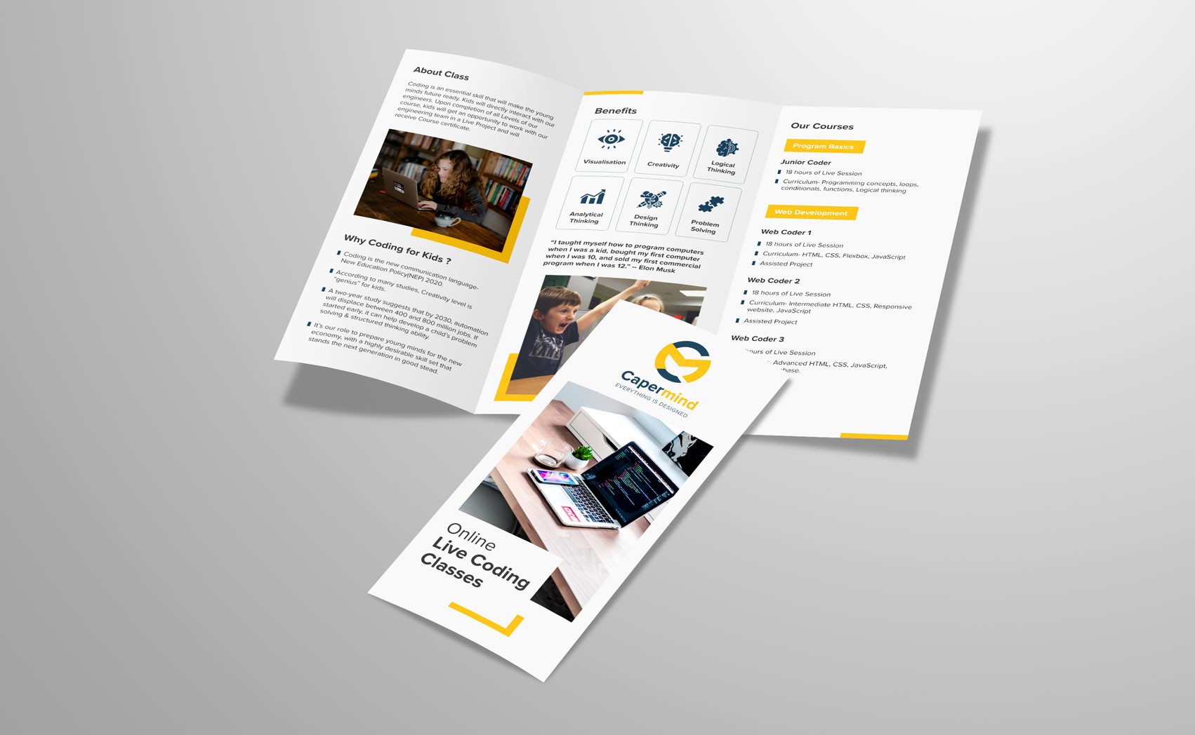 Designed an engaging and informative brochure for Capermind, an online coding coaching company for kids. The content highlights their courses, teaching methodology, and key benefits in a clear, visually appealing format. Structured to attract parents and young learners, the brochure emphasizes interactive learning, expert mentorship, and future-ready skills in a concise yet compelling manner.