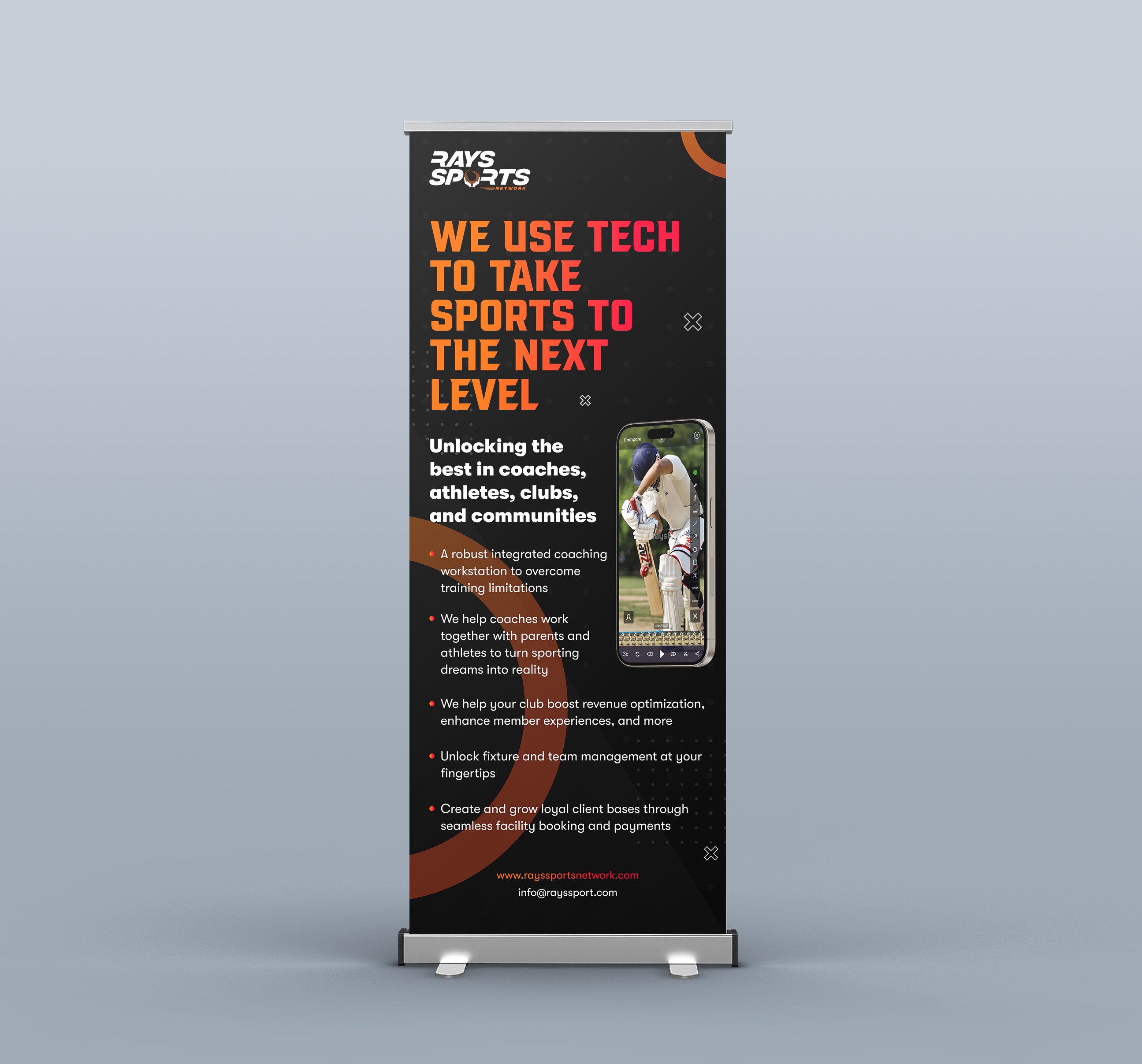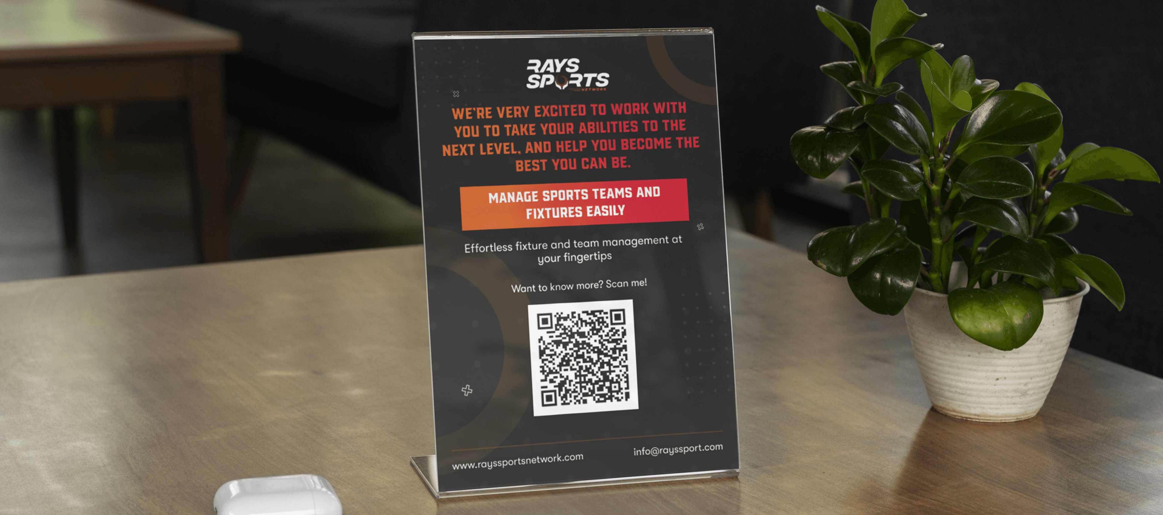 Designed a modern, sporty business card for Rays Sports Network featuring a prominent QR code for instant website access. The clean layout combines bold typography with dynamic colors to reflect athletic energy while maintaining professionalism. Strategic placement of the scannable QR code allows quick connection to their digital platform, enhancing user engagement. The design balances visual impact with functional utility for athletes, coaches, and sports academies.