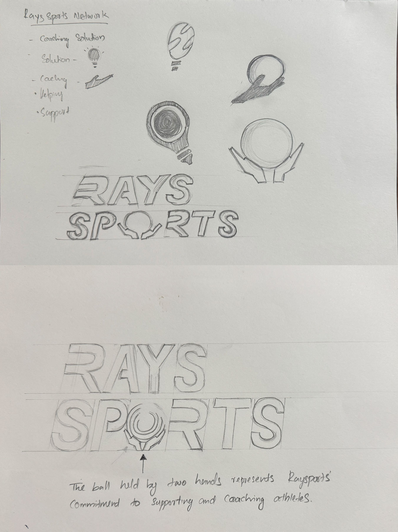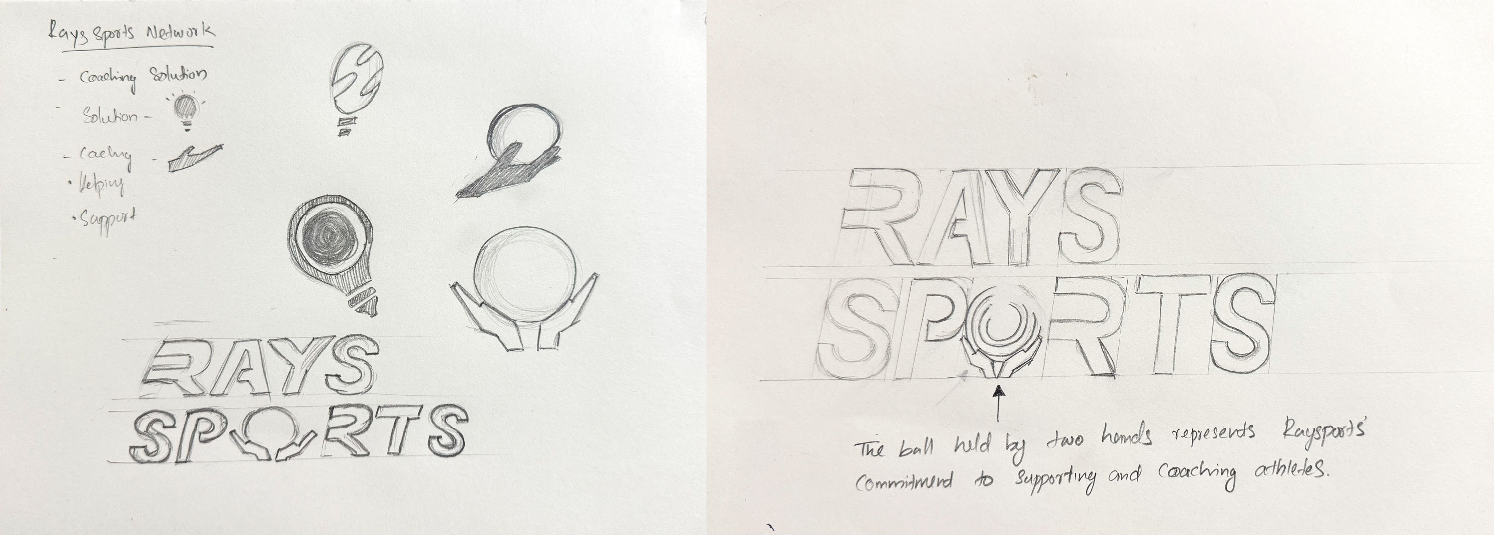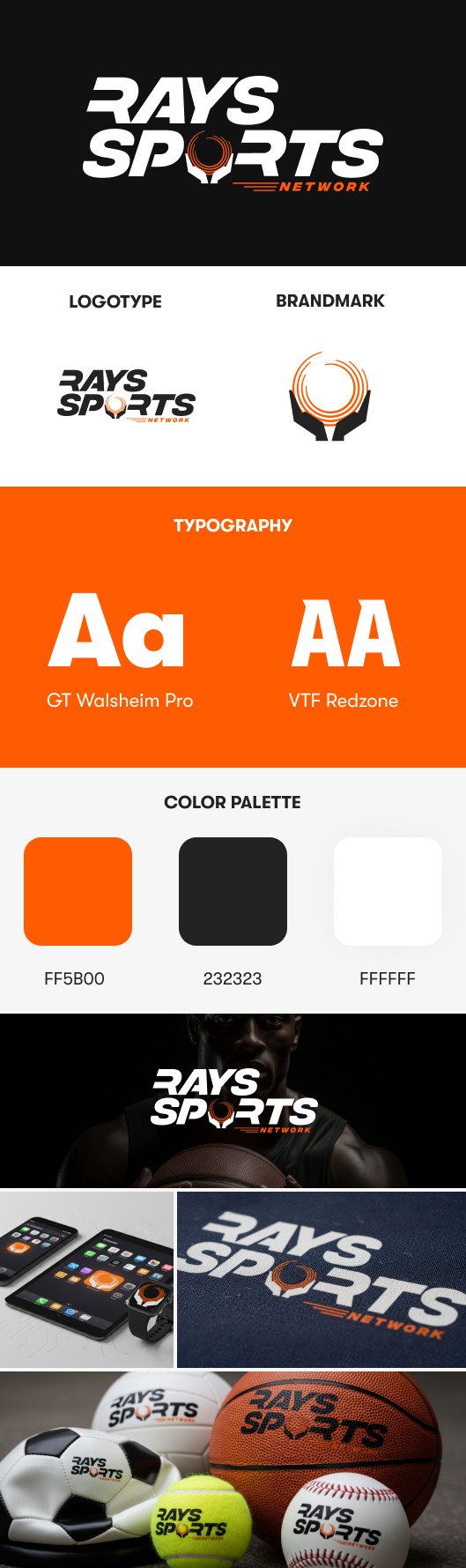 Designed a stylized text logo: "Rays Sports Network".Incorporated a ball held by two hands between the "P" and "R" to symbolize support and guidance.