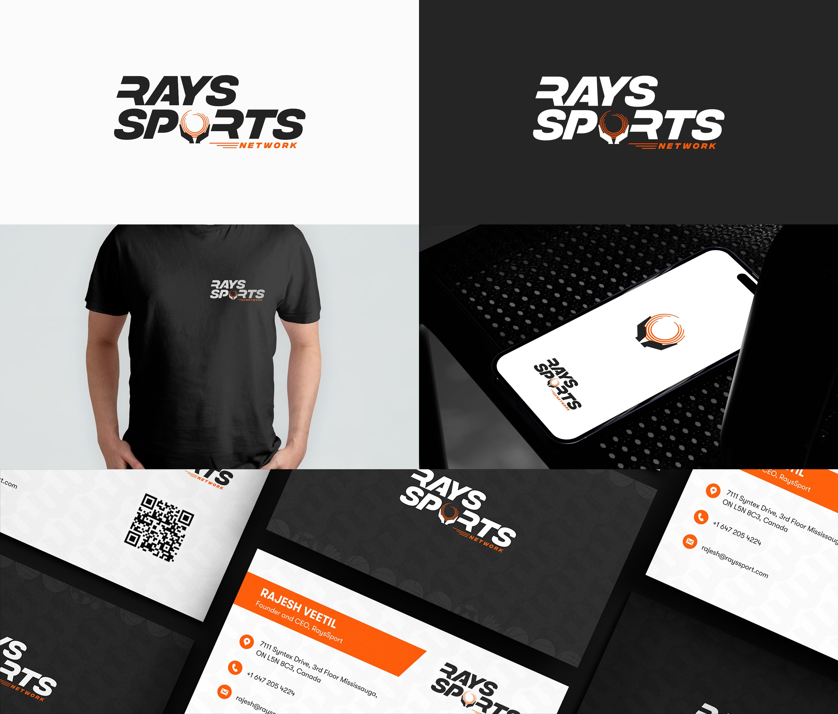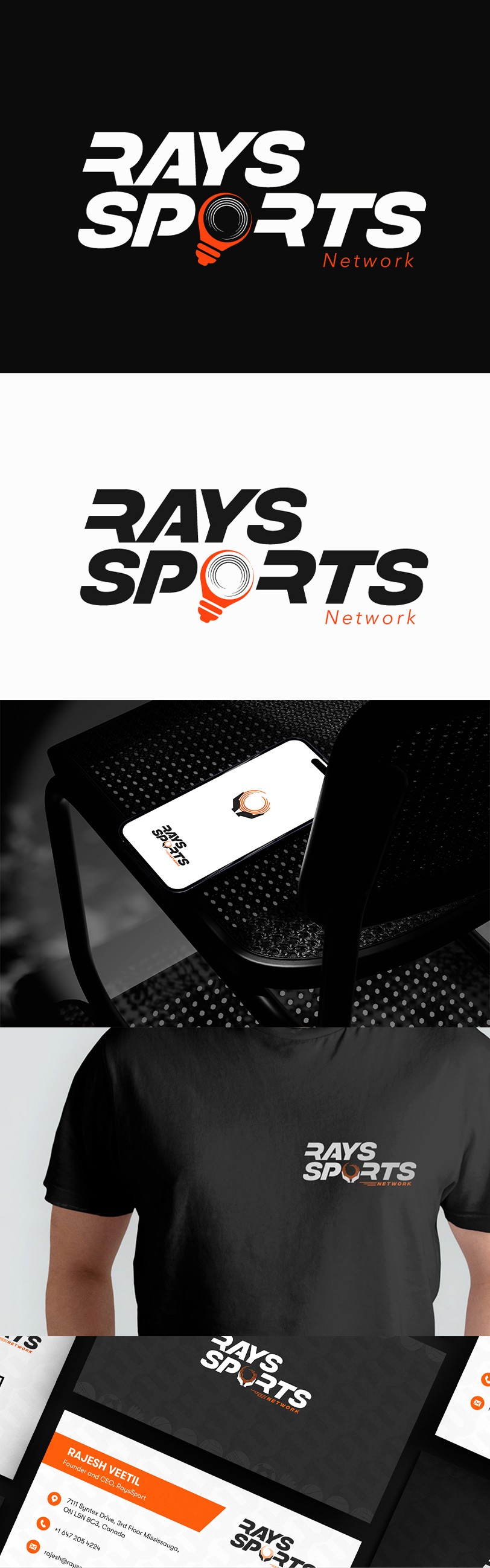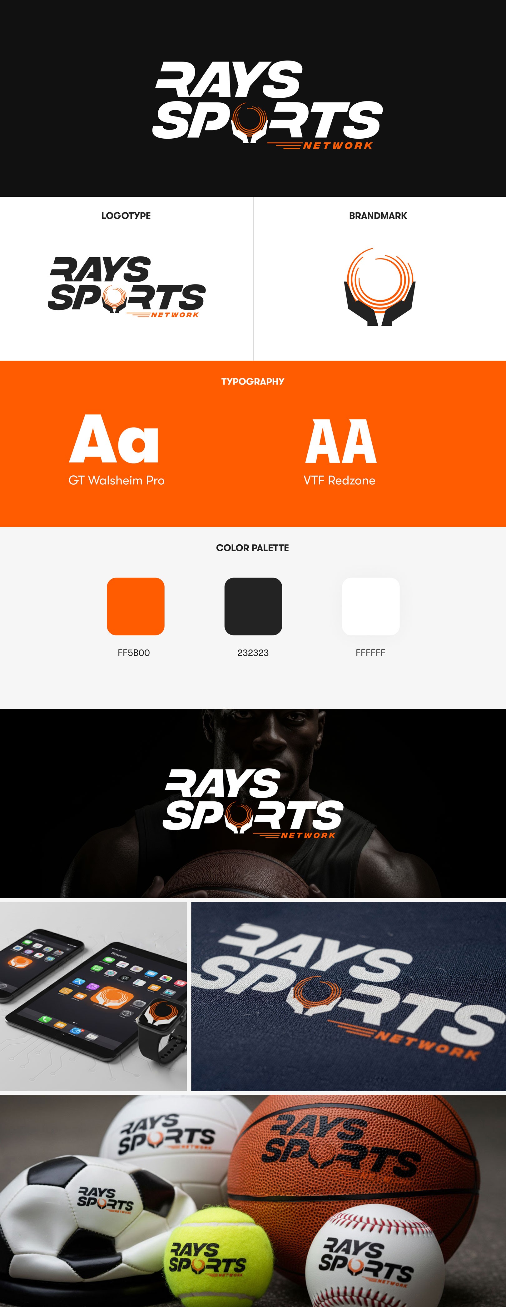 Designed a stylized text logo: "Rays Sports Network".Incorporated a ball held by two hands between the "P" and "R" to symbolize support and guidance.